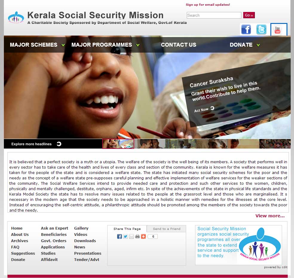 Taking up the welfare of its people as responsibility of the state, the Social Welfare Department of Kerala has joined hands with various departments and agencies to fulfill its duties towards the society. As part of the initiatives, the Social Security Mission was set up as per the Government Order no: G.O (MS) No: 56 / 2008/ SWD dated 14-10-2008. The mission is registered as a Charitable Society under the Government of Kerala with registration number T-1749/08.The headquarters of the organisation is in Thiruvananthapuram. The Governing Body consists of the Minister for Social Welfare as the Chairman and the Secretary to Government (Social Welfare) as Vice-chairman. Government of Kerala has provided an amount of Rupees 65 crore as corpus fund for the activities of the Mission.